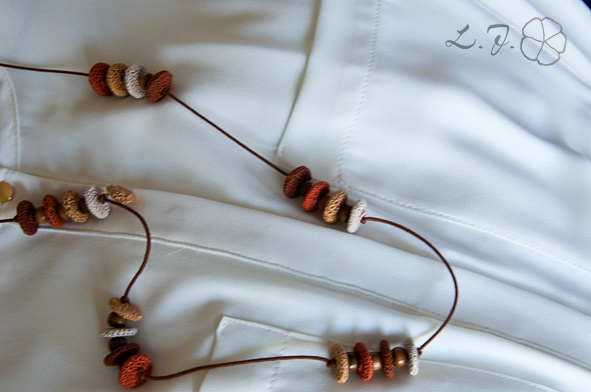 Collar de arandelas forradas a crochet e intercaladas con bolitas de madera formando series a lo largo de la cuerda. Ya sabes que los colores son a elegir.
